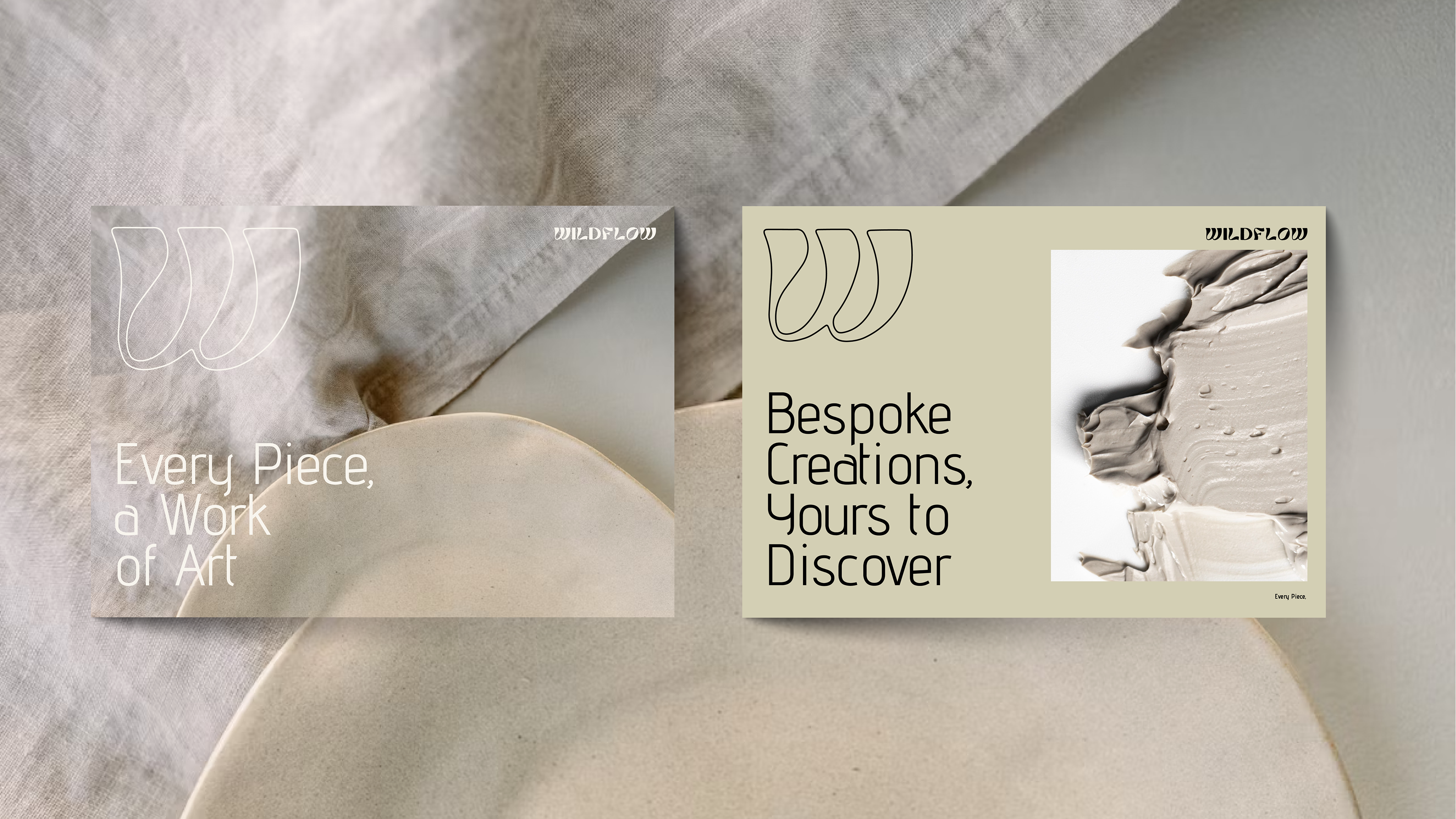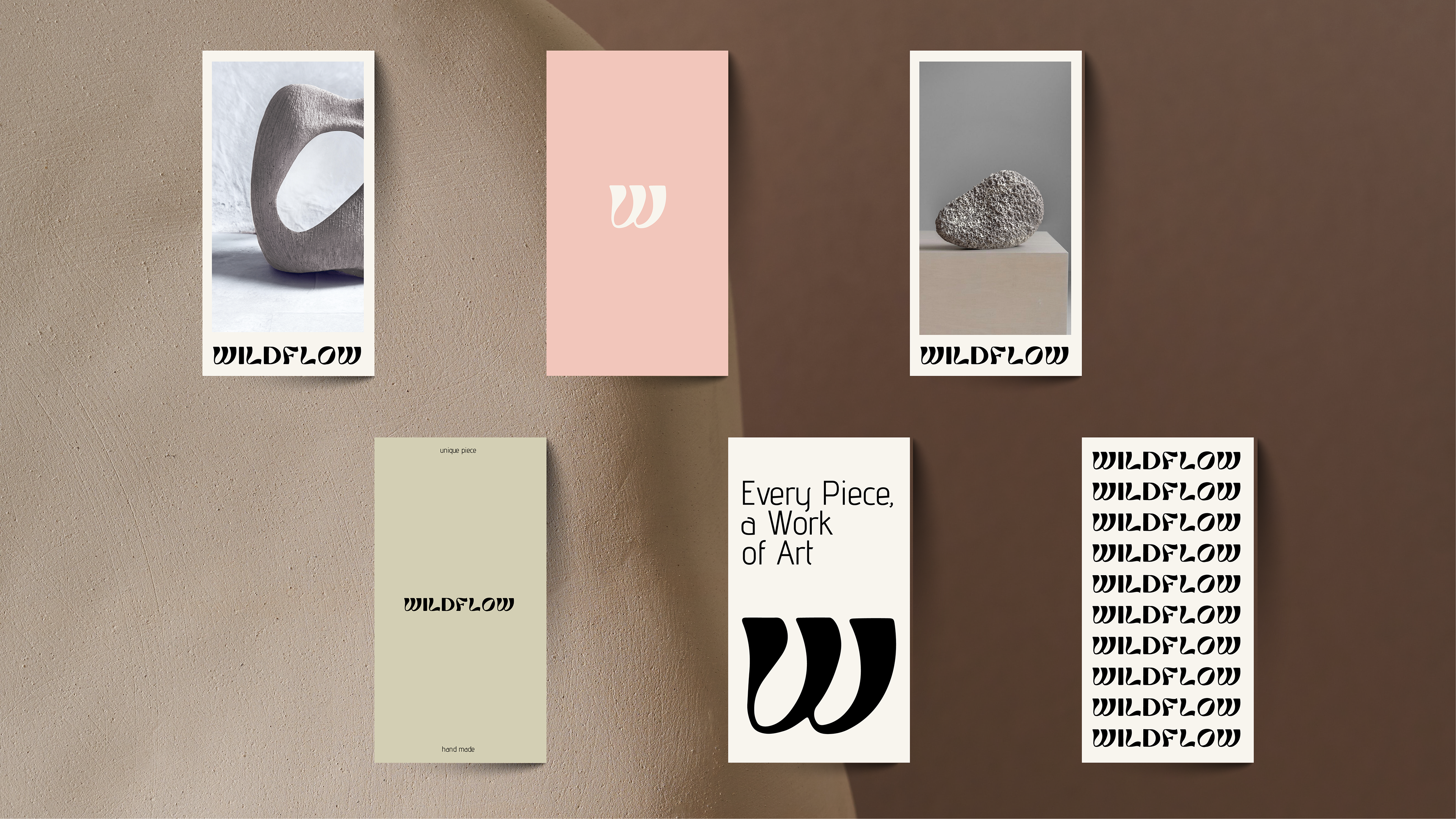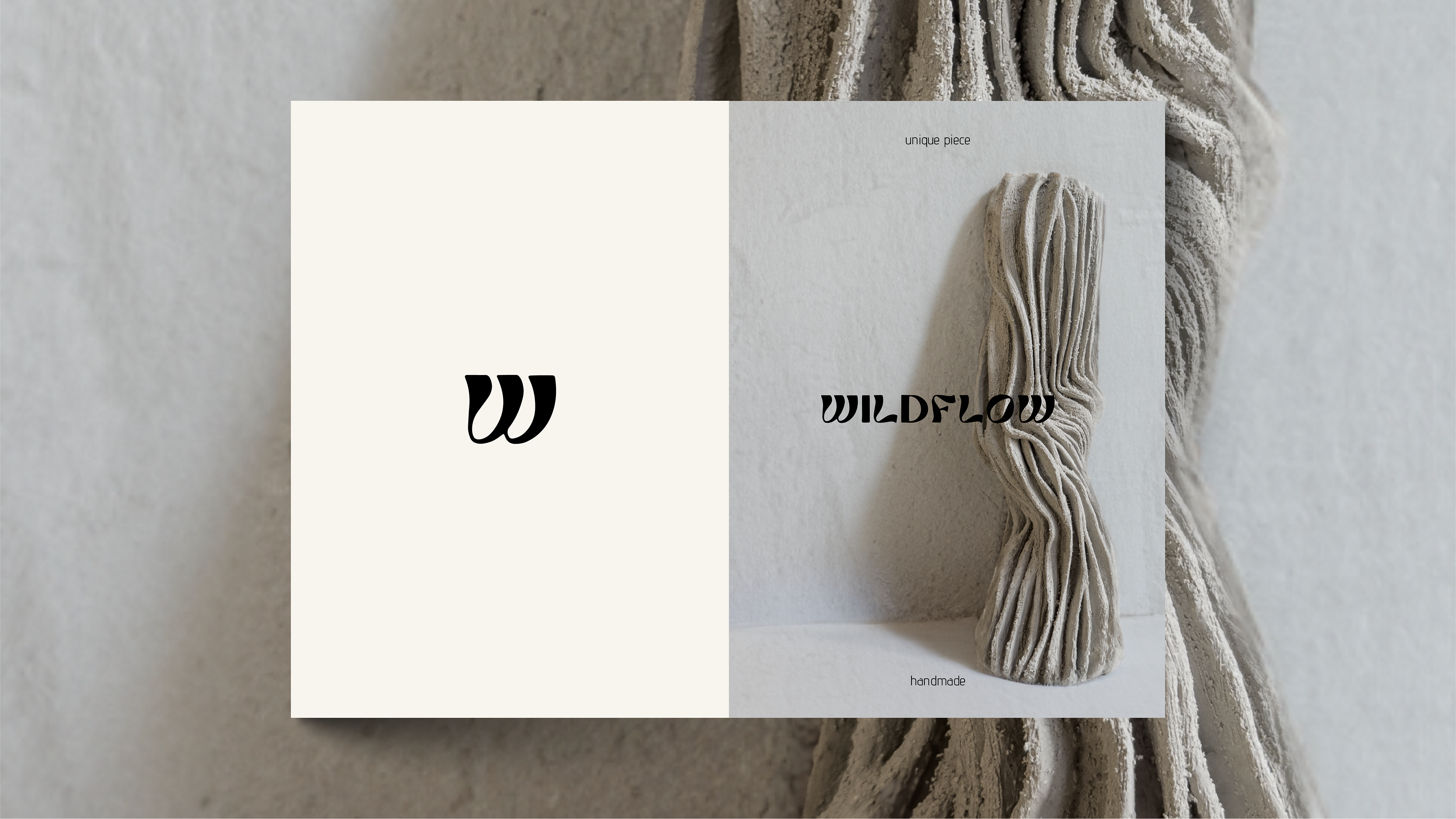 hand-built ceramic objects and visual identity design. Each piece is shaped entirely by hand, embracing irregularity, intuition and the quiet rhythm of craft. No mold, no repetition — every object is a unique form, carrying the gestures and material decisions of the moment. The visual identity was developed to echo that same organic movement. The Wildflow logo expands and flows like a soft gesture in space, mirroring the contours, textures and natural asymmetry of the ceramic pieces. Wildflow exists as a dialogue between material and identity, between tactile process and graphic expression — a project where object and design grow from the same hand.